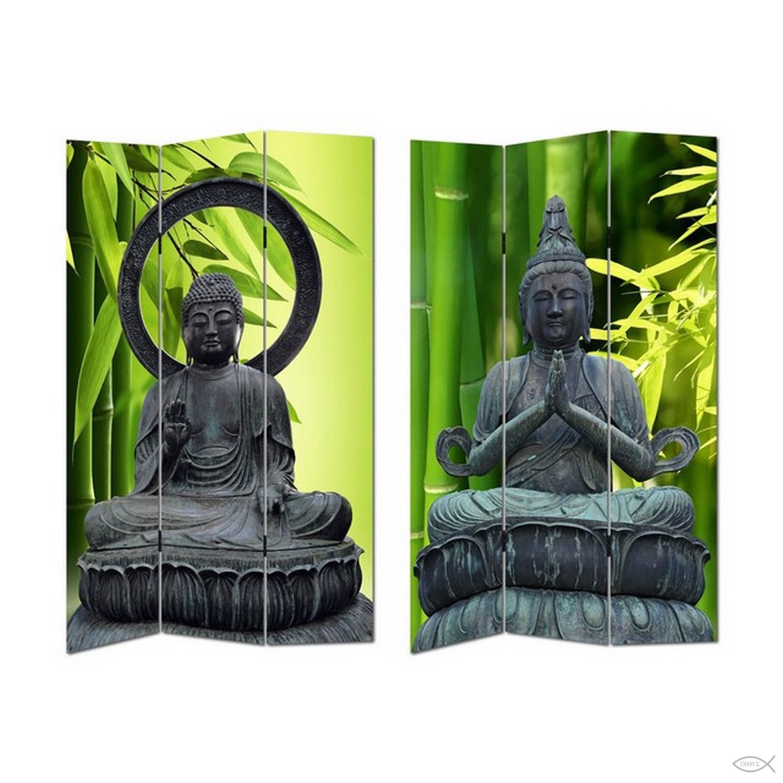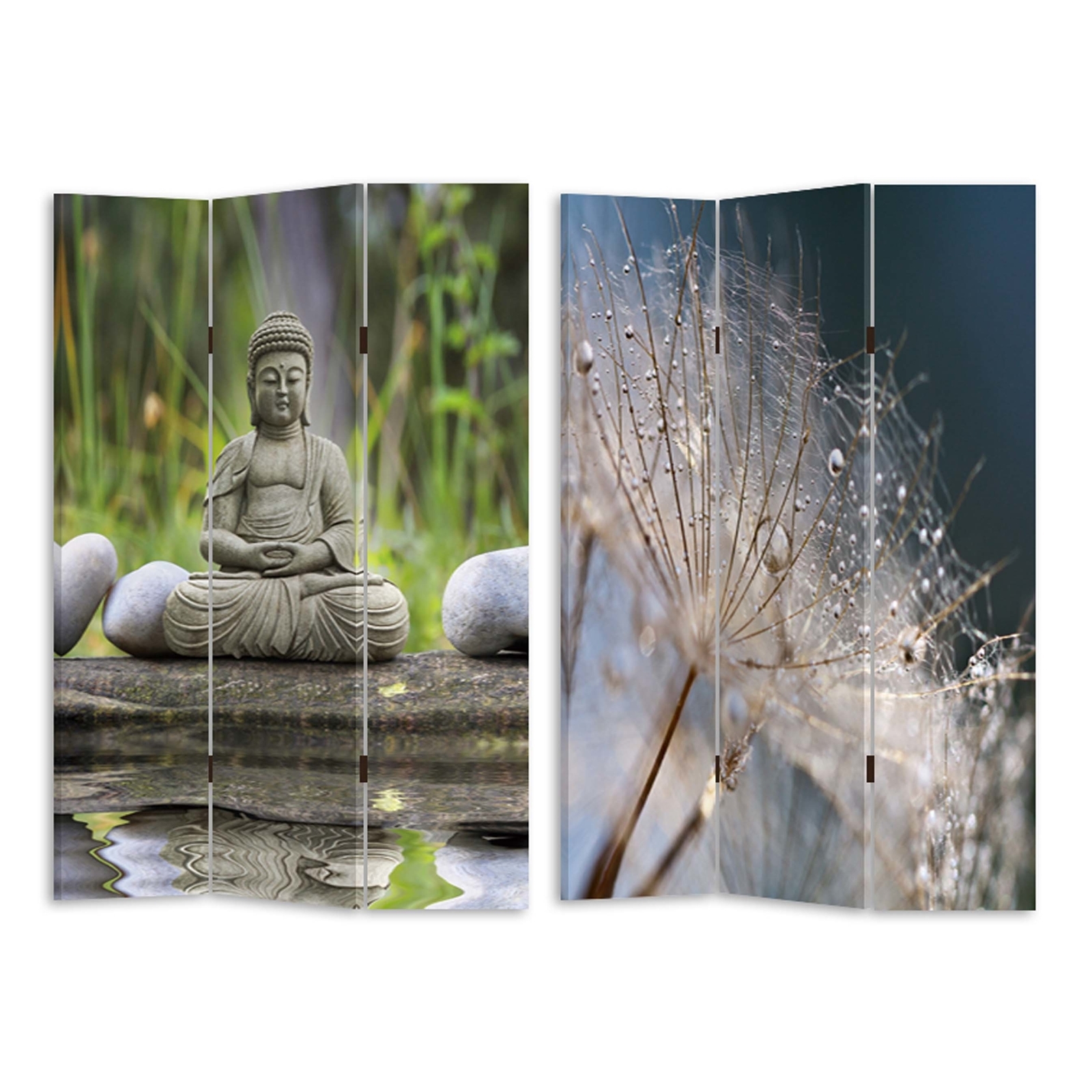 Stilvolles Wohnambiente für Ihr zu Hause! Der Paravent Buddha verkörpert moderne Eleganz sowie stilvolle Gradlinigkeit und überzeugt mit seinem hochwertigen Druckmotiv. Diese Spanische Wand ist beidseitig bedruckt, besteht aus drei Paneelen und steht Ihnen so als flexibler Raumteiler oder stilbewusster Sichtschutz zur Verfügung. Beide Motive des Paravents sind in einem zeitlosen Stil gehalten, dass sorgt für einen Hingucker in jedem Raum in dem der Paravent steht. Hochqualitative Scharniere sichern eine stabile Verbindung der einzelnen Paneele untereinander und garantieren somit einen festen Stand des gesamten Paravents. Der Korpus des Paravents besteht aus Tannenholz und ist mit hochwertigem Leinwandstoff bezogen.