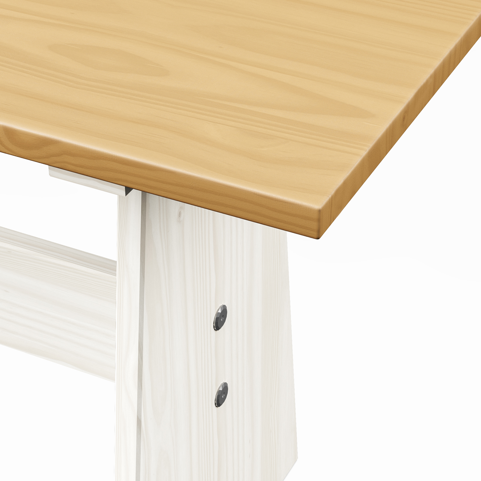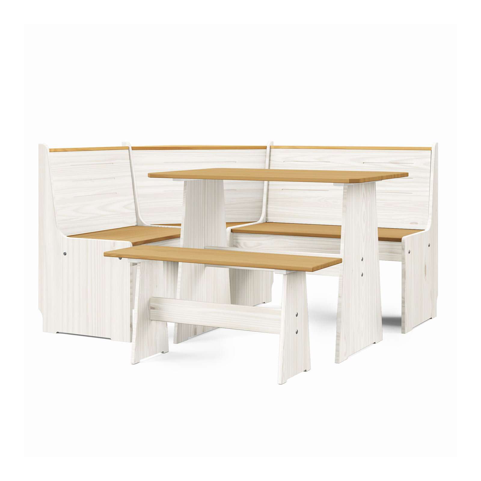 Die Sitzgruppe Marija im Landhausstil sorgt mit Ihrem natürlichen Charme für Gemütlichkeit in Küche und Esszimmer. Das Set bestehend aus Tisch, Eckbank mit Rückenlehne und Sitzbank bietet bis zu 5 Personen Platz und lädt zum geselligen Beisammensein ein. Die Möbel werden aus Kiefernholz gefertigt und mit Bienenwachs behandelt. Die Essgruppe mit weißem Korpus sowie Tischplatte und Sitzflächen in natürlicher Holzoptik fügt sich harmonisch in Ihr bestehendes Wohnambiente ein. Sie kann sowohl rechts- als auch linksseitig aufgebaut werden. Maße B/H/T: Tisch 100 x 73,3 x 60 cm, belastbar bis 142 kg Eckbank Stellmaß 151 x 85 x 118 cm, Sitzhöhe 43,4 cm, Sitztiefe 39 cm, belastbar bis 136 kg Sitzbank 92 x 43,4 x 28 cm, belastbar bis 102 kg Weitere Maße siehe Abbildung.