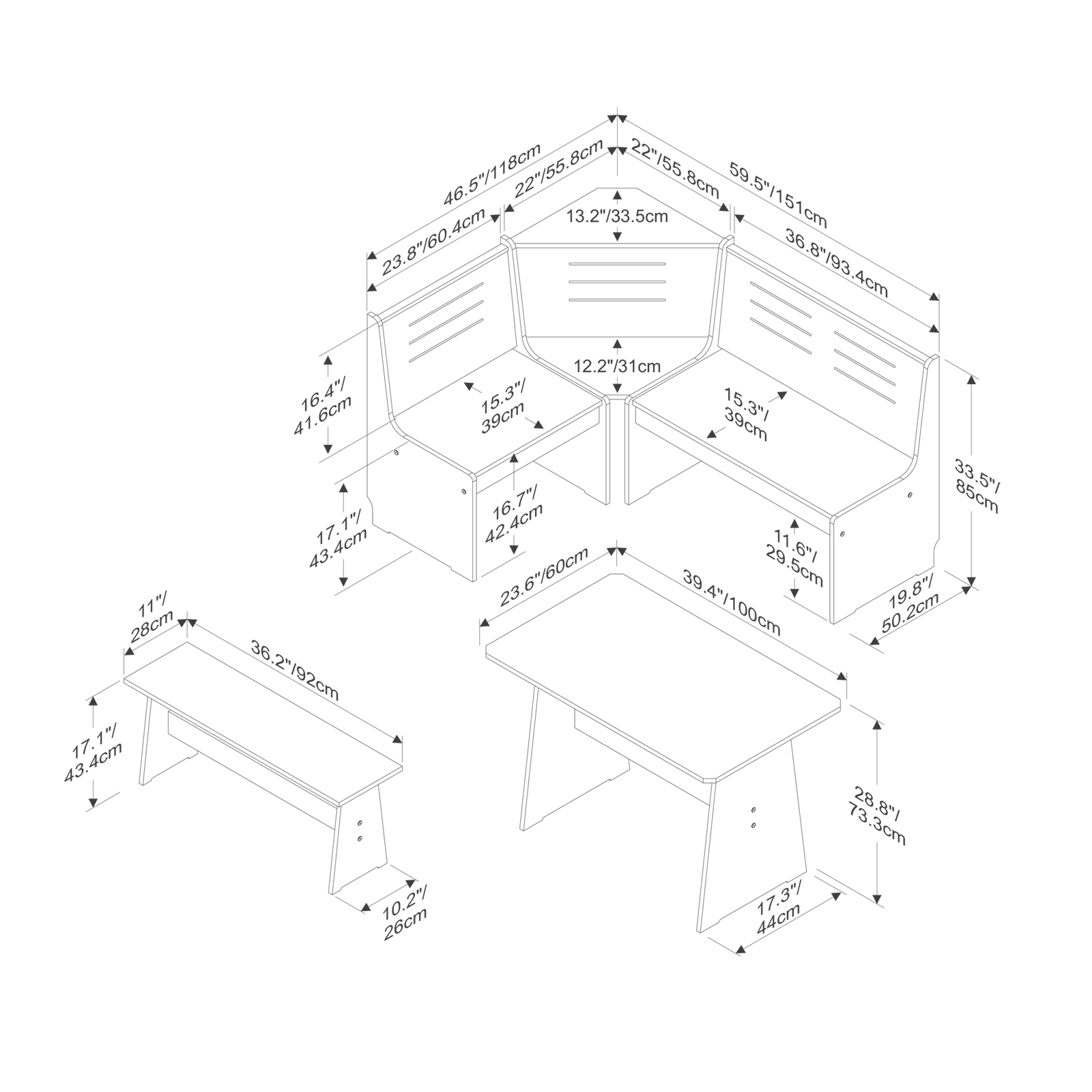 Maße: Tisch 100 x 73,3 x 60 cm, Eckbank Stellmaß 151 x 85 x 118 cm, Sitzhöhe 43,4 cm, Sitztiefe 39 cm, Sitzbank 92 x 43,4 x 28 cm