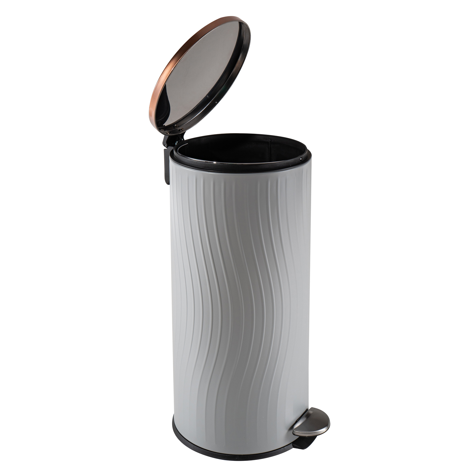 Der Mülleimer Jannik verbindet Funktionalität mit modernem Design und setzt in jeder Küche oder im Badezimmer ein stilvolles Statement. Mit seinem eleganten Wellenrelief und dem edlen kupferfarbenen Deckel ist er nicht nur ein praktischer Alltagshelfer, sondern auch ein dekorativer Blickfang.