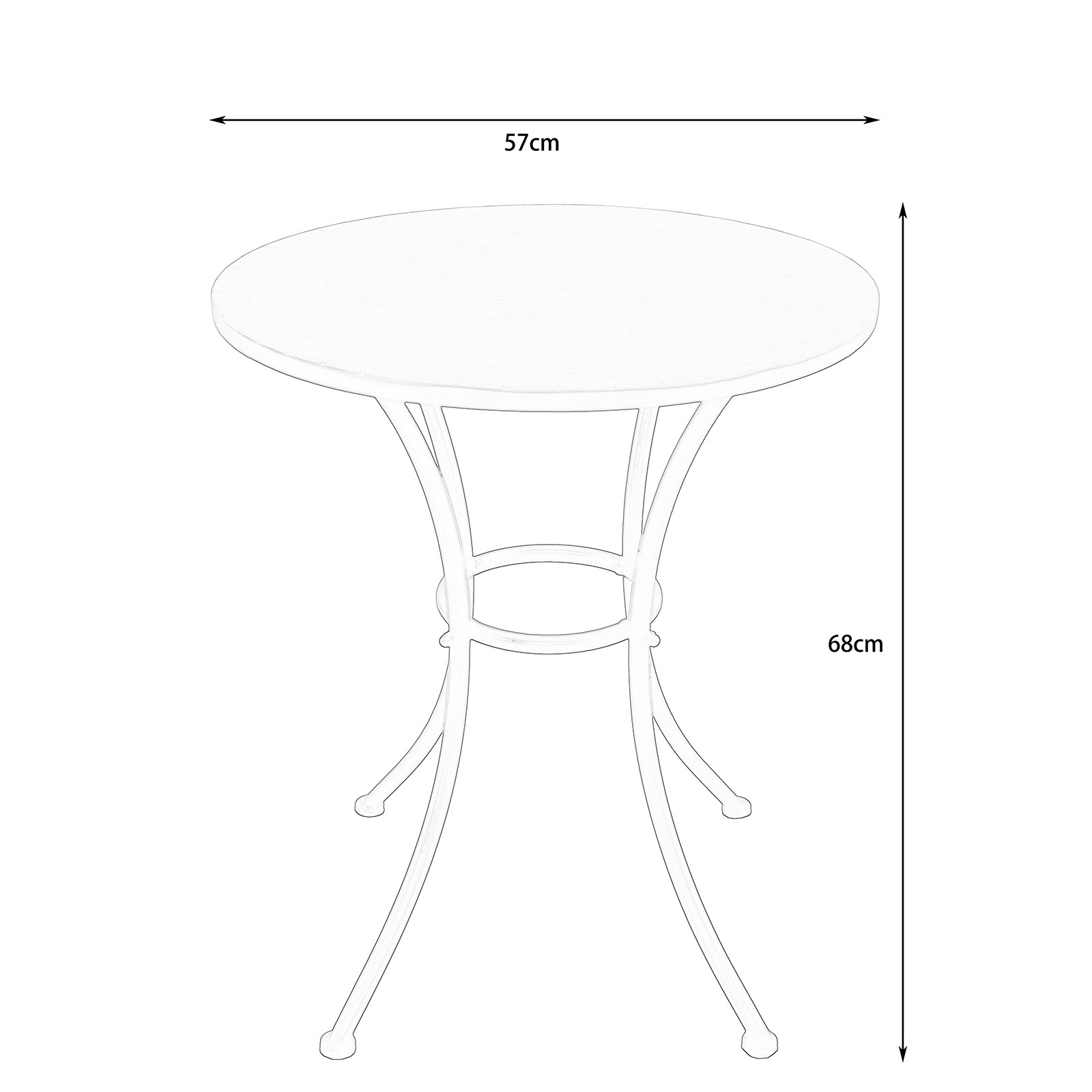 Maße: Tisch Ø 57 x Höhe 68 cm, Stühle B/H/T 35 x 89 x 37 cm, Sitzhöhe 47 cm, Material: Metall