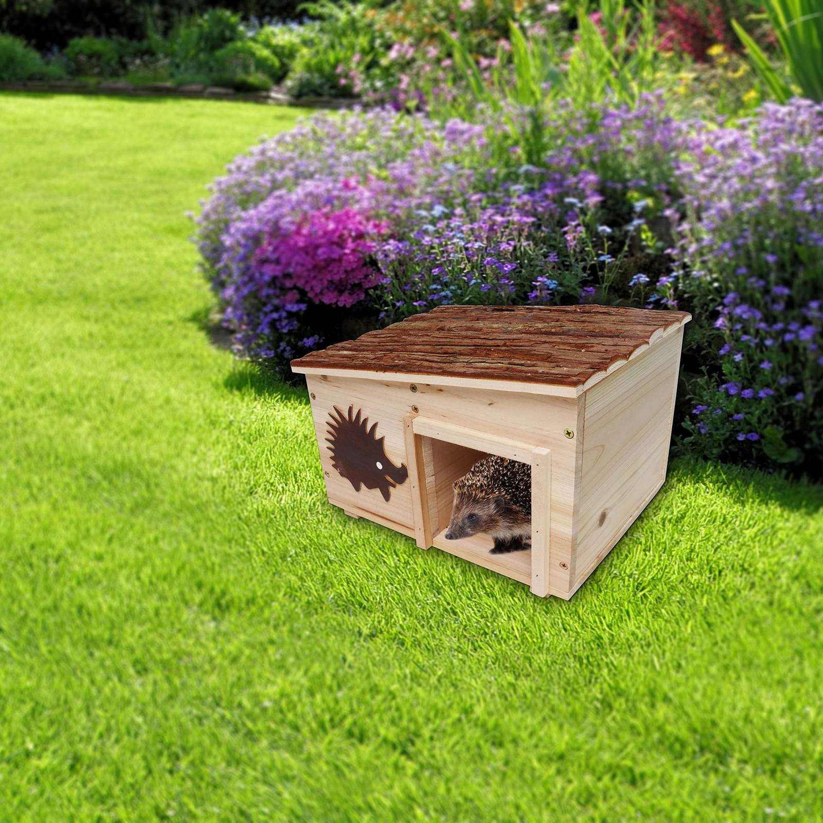 Dieses schöne Igelhaus bietet dem kleinen Wald- und Wiesenbewohner ein schönes Zuhause. Achten Sie beim Aufstellen im Frühherbst darauf, dass der Eingang wettergeschützt und trocken steht. Bedecken Sie das Winterquartier zusätzlich mit Laub. Damit sich der Igel rundum wohlfühlt, können Sie die Hütte mit Stroh, Heu oder Laub füllen. Bitte beachten Sie, den Igel während des Winterschlafs nicht zu stören. Maße: B/H/T 26 x 21,5 x 32 cm, Öffnung 12 x 12 cm, Material: Holz Hinweise zu Holzprodukten für den Außenbereich: Die Holzoberflächen sind offenporig und nehmen Feuchtigkeit auf. Mit der Nässe dringen auch Mikroorganismen und Schimmelpilze ein und finden im Inneren ideale Entwicklungsmöglichkeiten. Befallenes Holz verfärbt sich, wodurch es fleckig, unansehnlich und grau wird. Langfristig feucht bleibendes Holz wird vollkommen zersetzt. Unsere Produkte sind werksseitig vorimprägniert für den Transport vom Hersteller zum Lieferanten. Schon beim Aufbau sollten Sie auf die Imprägnierung achten. Wir empfehlen eine zusätzliche und dann jährliche Imprägnierung. Viele Stellen kann man nach der Fertigstellung nicht mehr mit einem Quast und Sprühgerät erreichen. Schon eine kleine, vergessene Stelle bietet der Feuchtigkeit Angriffsfläche.