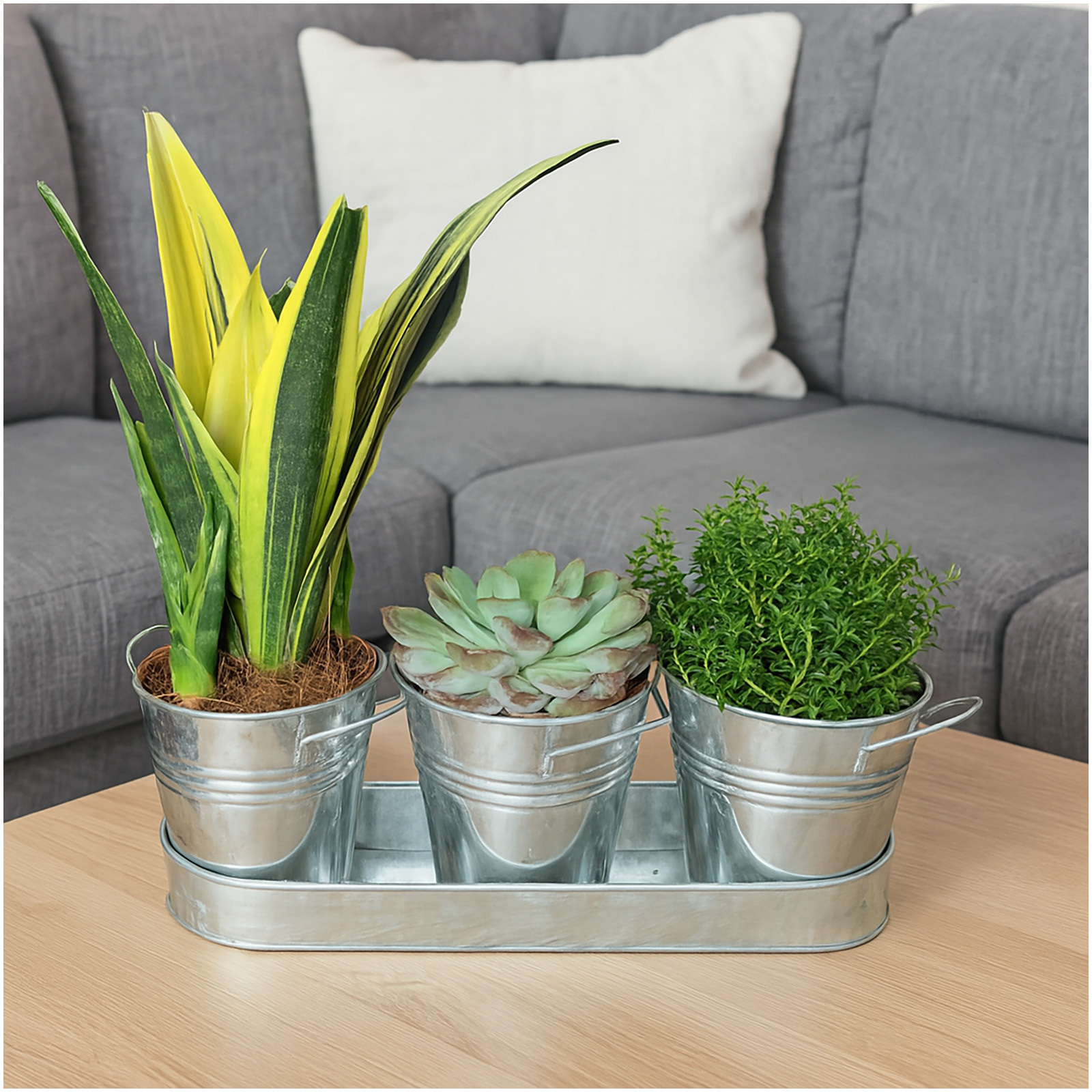 Bringen Sie frisches Grün in Ihr Zuhause mit dem dekorativen Zinktöpfe 3er-Set mit Tablett. Die... mehr