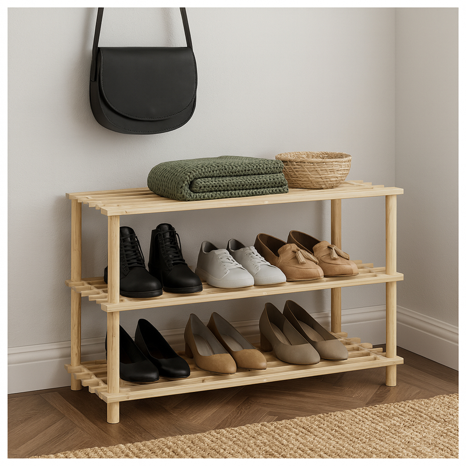 Dieses elegante Schuhregal aus Bambus vereint Funktionalität mit modernem Design. Mit den Maßen B/H/T 74 x 48,5 x 26 cm bietet es auf 3 Ebenen ausreichend Platz für Ihre Schuhe – von Sneakers über Sandalen bis hin zu eleganten Pumps. Das robuste Material Bambus ist nicht nur langlebig, sondern auch nachhaltig und sorgt für ein natürliches Raumklima. Durch die kompakte Bauweise passt das Regal ideal in den Flur, die Garderobe oder den begehbaren Kleiderschrank.