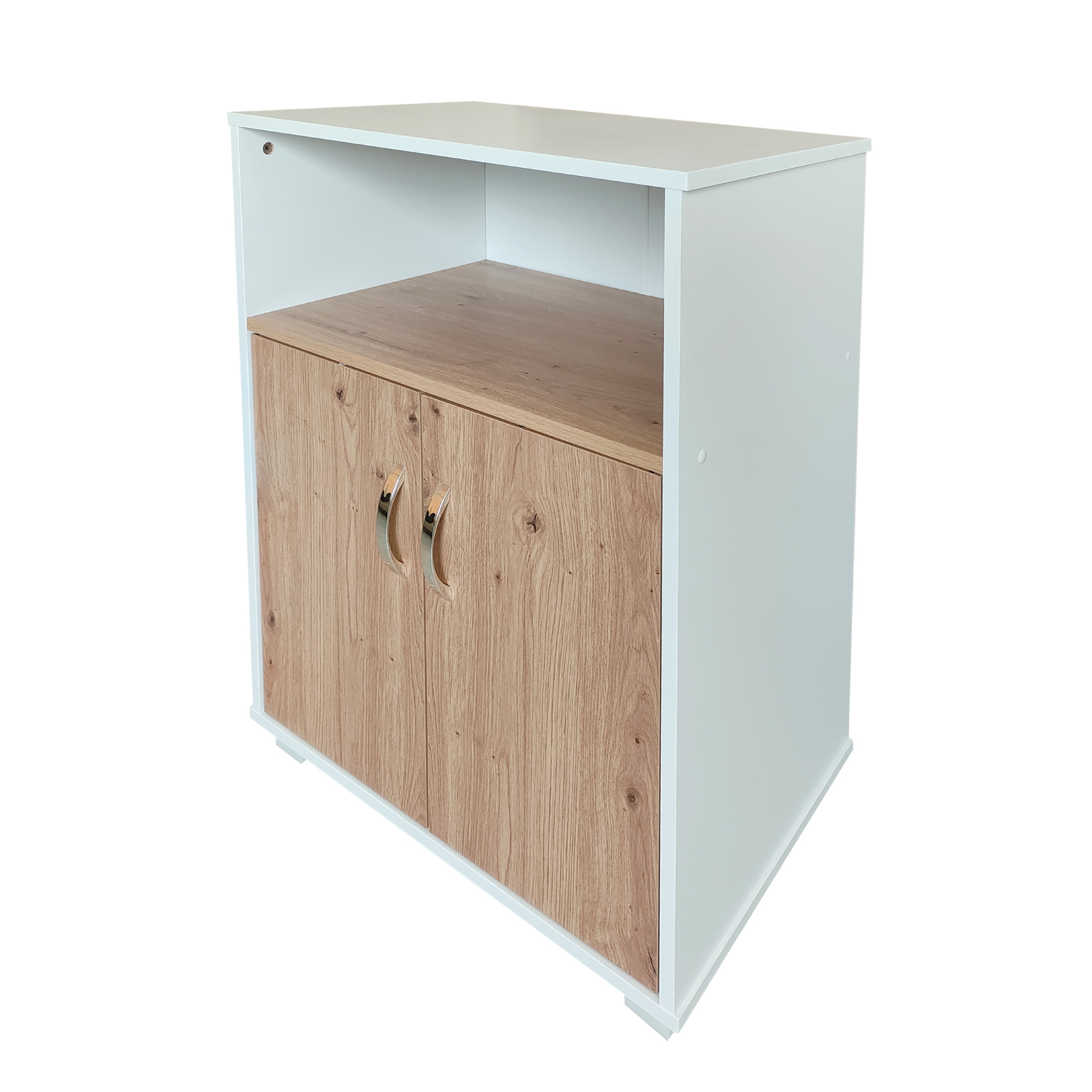 Mit seiner kompakten Größe passt der Schrank auch in kleine Räume und bietet durch die Kombination aus offenem Fach und Doppeltüren flexible Stauraummöglichkeiten.