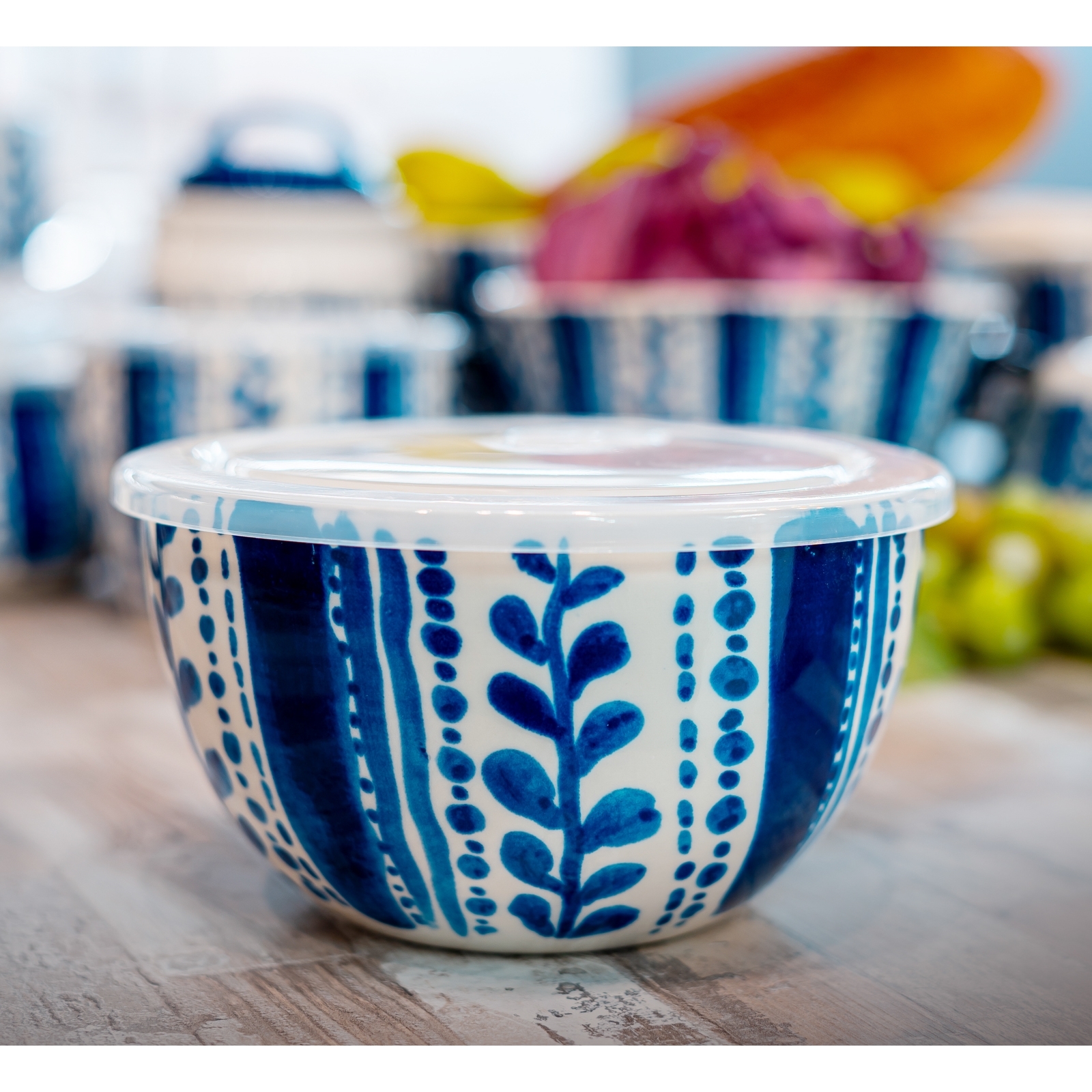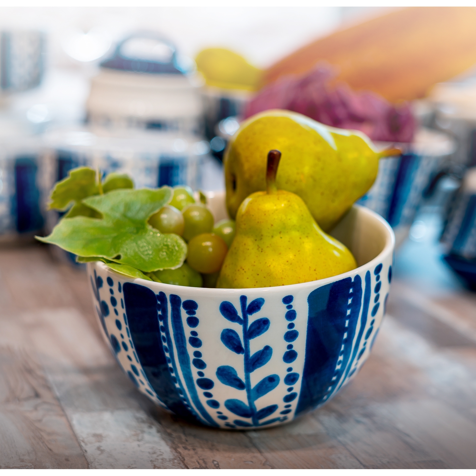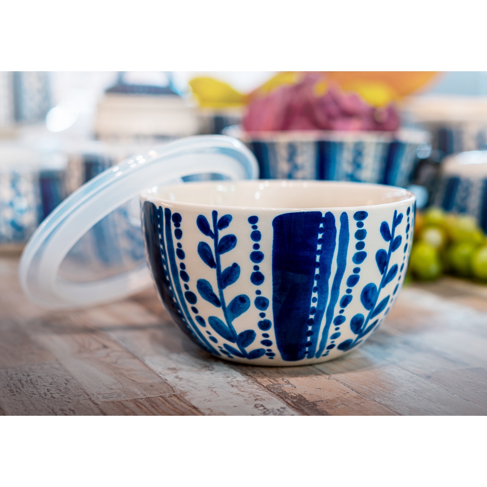 Praktisches Geschirr aus Keramik mit farbigen Dekoren im Landhausstil. Die Schüsseln mit Deckel sind die Alternative zum Mikrowellengeschirr aus Kunststoff. Aber auch als Servierschale und Vorratsdose finden diese Verwendung. Mikrowellen- und spülmaschinengeeignet, Maße Ø 15,2 cm, Höhe 9,3 cm, Nutzinhalt 1000 ml