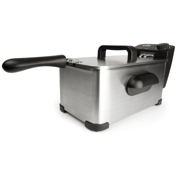 Edelstahl Fritteuse mit Deckel, Fassungsvermögen 3,0 Liter, Leistung max. 2000 Watt, Stufenlos regelbarer Thermostat zwischen 150°C - 190°C, 2 Kontrollleuchten (Betrieb und Bereitschaft) Entnehmbare Heizspirale und Fettwanne, Entnehmbarer antihaft-emaillierter Topf, Eingetauchtes Heizelement aus Edelstahl, Hitzeabweisende Griffe, Inkl. großem Fritierkorb, Antihaft-Füße, Gehäuse und Deckel aus rostfreiem Edelstahl. VDE-Stecker, Überhitzungsschutz
