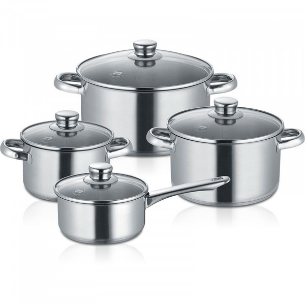 Das praktische Set besteht aus 4 verschiedenen Töpfen, jeder mit einer anderen Größe. Die Töpfe sind aus Edelstahl gefertigt und für alle Wärmequellen geeignet. Dank des dicken Aluminiumbodens speichern die Töpfe die Wärme lange Zeit. Außerdem sind sie mit Glasdeckeln versehen, sodass Sie Ihre Gerichte beim Kochen im Auge behalten können! Alle Töofe sind mit Deckel ausgestattet. Maße der 4 Töpfe: Ø 16 cm für 1,75 Liter / Ø 20 cm für 3,5 Liter / Ø 24 cm für 5 Liter / Ø 16 cm für 1,2 Liter
